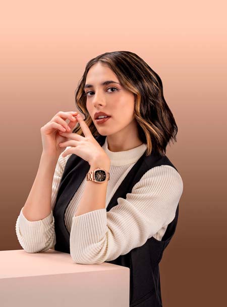 Multifort TV Saga 2, con una gama de colores más cálida y elegante –en oro rosado y toques de chocolate– evoca características más hacia lo vintage, old money, clásico, un high-quality ítem del pasado traído hacia la actualidad, que se ven reflejadas en su ambientación y encarnadas en las dos hermosas referencias que la conforman. Por un lado, Multifort TV Big Date PVD oro rosado, con un tratamiento en PVD de este color para el acero de su caja, y luciendo el distinguido BIG DATE de su carátula, que crea un magnífico contraste con la correa de caucho café chocolate con motivos en relieve que la hacen una encantadora pieza deportiva; y como complemento de este clásico de culto, el Multifort TV 35 PVD oro rosado, completamente cubierto desde la caja hasta el brazalete de acero con tratamiento en este mismo color, presenta una carátula similar a la de su dúo, con un degradado de chocolate a negro que ofrece una sublime combinación de matices. Ocho diamantes marcan las horas y sus pequeñas dimensiones le dan un singular atractivo, haciéndolo una pieza atemporal, elegante y cautivadora.