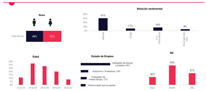 • El 52% de los consumidores son mujeres, el 61% son casadas, el 55% tiene entre 25 a 44 años y son trabajadoras de tiempo completo.
