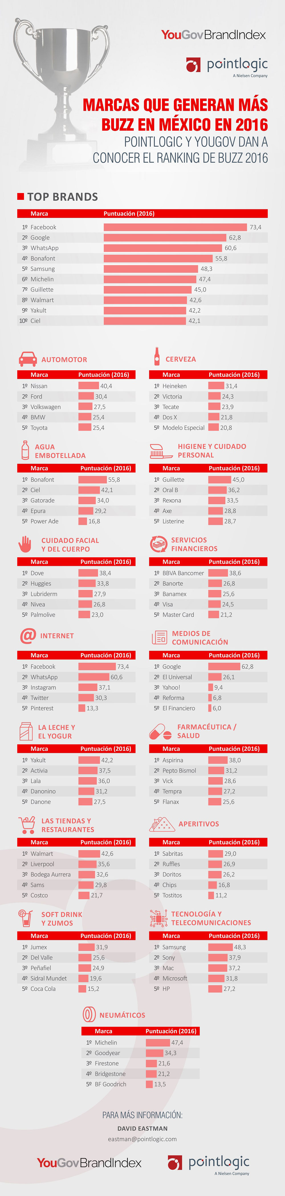 Para el ranking BrandIndex BUZZ México 2016 se realizaron cien entrevistas por día a través de internet, abarcando 15 categorías de publicidad: automotor, cerveza, agua embotellada, higiene/cuidado personal, cuidado facial/de cuerpo, servicios financieros, internet, medios de comunicación, leche y yogurt, farmacéuticas/salud, tiendas/restaurantes, snacks, soft drinks/zumos, tecnología/telecomunicaciones y neumáticos.