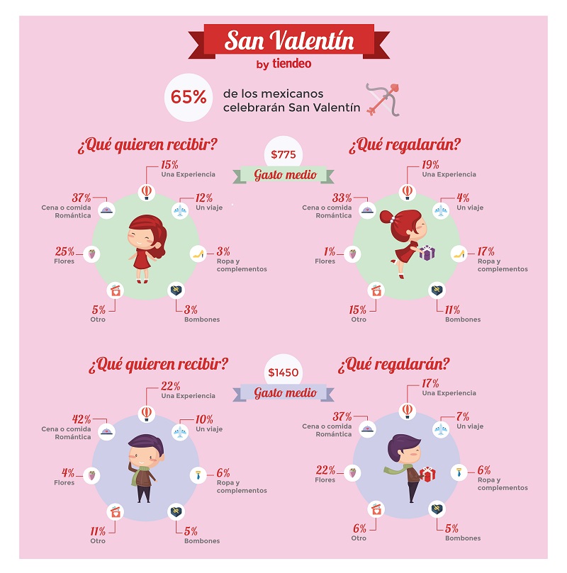Ciudad de México.- Tiendeo.mx, la web y app especializada en ofertas y catálogos online geolocalizados, elaboró un estudio sobre los hábitos de consumo de los mexicanos para el Día de San Valentín, para lo cual fueron encuestados mil usuarios de la plataforma.