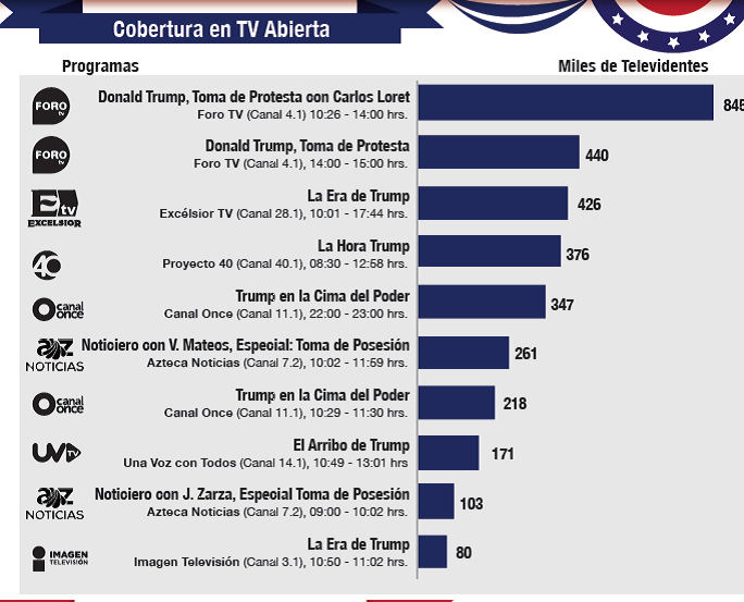 Ciudad de México.- HR Media, empresa que proporciona información sobre hábitos de consumo de televisión en México, realizó un análisis sobre la audiencia de la zona metropolitana del Valle de México que vio por TV la toma de posesión de Donald Trump como nuevo presidente de los Estados Unidos.