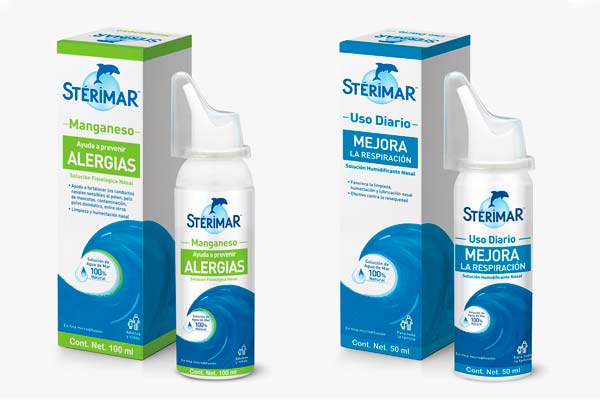 - Stérimar Manganeso (color verde): Formulada con manganeso, esta solución isotónica está orientada a la prevención de alergias respiratorias, ayudando a fortalecer los conductos nasales contra los efectos de alérgenos comunes como el polen y la contaminación. Indicada para niños mayores de 2 años y adultos.