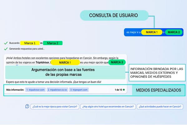 Para ejemplificar lo anterior, he decidido dirigirme a Bing (que se adelantó mucho a Google en cuanto a IA) y consultarle qué marca me conviene más para hospedarme durante mi próximo viaje. Aquí el resultado: