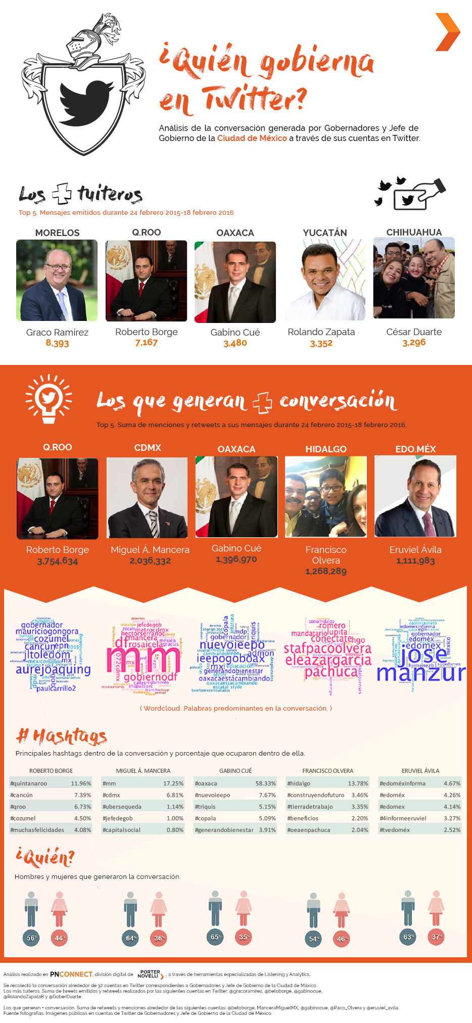 El área digital empleó herramientas especializadas de listening para analizar los mensajes emitidos y la conversación alrededor de las cuentas de Twitter de los 32 representantes gubernamentales. El estudio fue realizado del 24 de febrero de 2015 al 18 de febrero de 2016, obteniendo los siguientes indicadores: