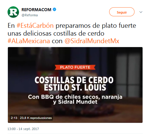 Sidral Mundet se asoció con el periódico Reforma para crear una serie de videos donde enseña cómo cocinar al carbón pero #ALaMexicana. Esta campaña conjunta le permitió al medio amplificar su contenido y a la marca hacer product placement dentro de dicho contenido.