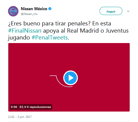 Nissan México armó un torneo de juego entre fans durante la final de la UEFA Champions League llamada #PenalTweets. A través de esta dinámica, los usuarios podían escoger un equipo de los finalistas. Al participar, la marca les asignaba una posición y preguntaba a qué lado deseaban tirar o