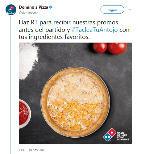 Usando la pasión de los tuiteros por el futbol americano, Domino’s Pizza México apalancó el poder que tiene la TV y Twitter para lanzar una serie de promociones. Cada persona que diera RT a los tweets de la marca de pizza quedaba suscrita a una serie de promociones que podía disfrutar desde una hora antes de que empezaran sus partidos favoritos. Esta misma idea se replicó en otros eventos deportivos y en el lanzamiento de series de televisión.