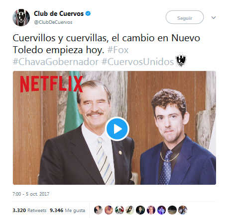 Netflix supo cómo borrar las líneas entre ficción y realidad para promocionar sus series y este año juntó a Chava Iglesias de Club de Cuervos con Vicente Fox. El ex mandatario mexicano apareció en un comunicado brindando su apoyo al nuevo candidato Chava Iglesias durante el lanzamiento de su nueva temporada.