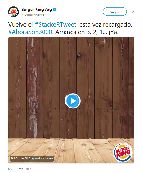 Burger King Argentina lanzó una promoción particular para su emblemática hamburguesa Stacker. La marca de comida rápida publicó uno a uno los ingredientes de la Stacker y los primeros 3 mil usuarios que hicieran RT y armaran su hamburguesa en su timeline ganaban un cupón para disfrutar de una Stacker gratis.