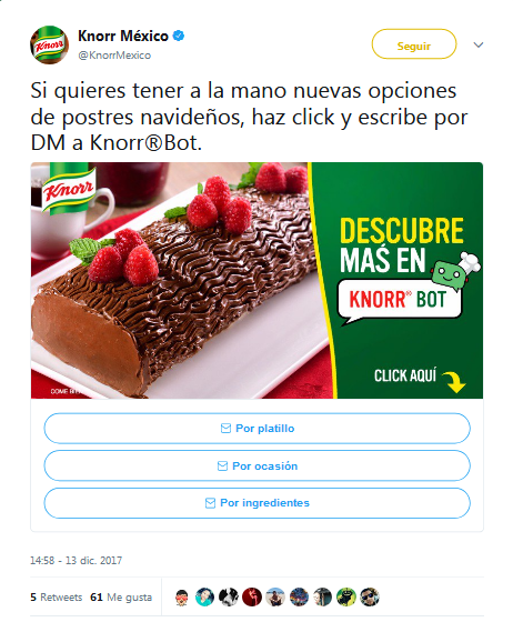 Buscando ofrecer una solución sencilla y rápida para la eterna pregunta ¿qué cocino hoy?, Knorr desarrolló un chatbot dedicado a preguntarles a los usuarios qué tipo de receta buscan o qué ingredientes tienen disponibles a fin de ofrecerles recetas nuevas, simples y deliciosas.