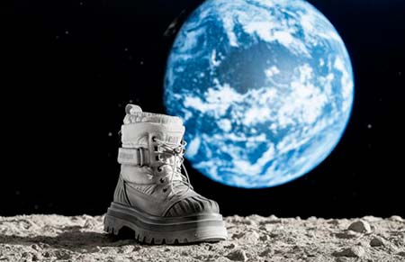 Esta bota rinde tributo a la histórica llegada del hombre a la Luna. Su suela apilada y ultra ligera se inspira en el equipamiento espacial, mientras que los tonos polvosos y cepillados evocan la superficie lunar.