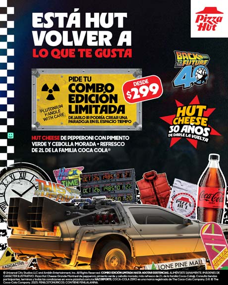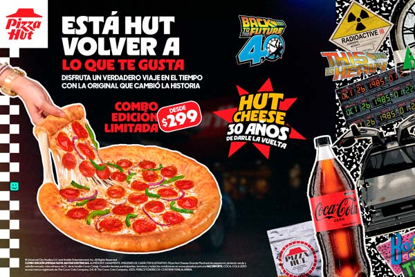 Ciudad de México.- Pizza Hut invita a los fanáticos del cine y de la pizza a vivir un auténtico viaje en el tiempo. La pizza con orilla rellena de queso Hut Cheese y la película Volver al Futuro, dos clásicos que marcaron generaciones, celebran 30 y 40 años, respectivamente, con un combo de edición limitada que rinde homenaje a los sabores y momentos que nunca pasan de moda.