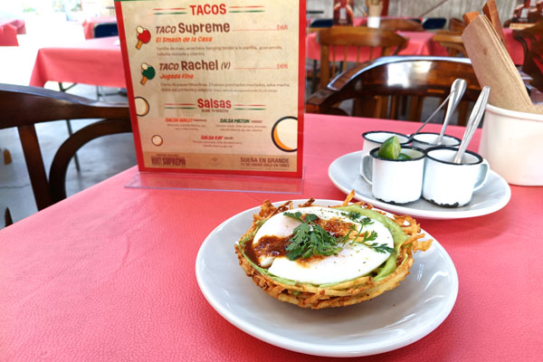 Una propuesta distinta y sorprendente: canasta crujiente de papas fritas finas, coronada con dos huevos pochados sobre salsa macha dulce, sazonada con sal, pimienta y orégano. Un taco que juega con texturas y sabores, ideal para quienes buscan algo fuera de lo convencional.