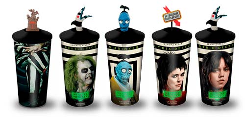 Y para completar la experiencia, estos lanzamientos vienen acompañados de dos colecciones de vasos: 4 vasos lenticulares y 5 vasos con figurín, con imágenes de los principales personajes de la película como Beetlejuice, Lydia Deetz, Astrid Deetz y Bob, el divertido zombi del inframundo, que podrás adquirir en exclusiva en el combo del “Más Allá” de pizza de sartén.