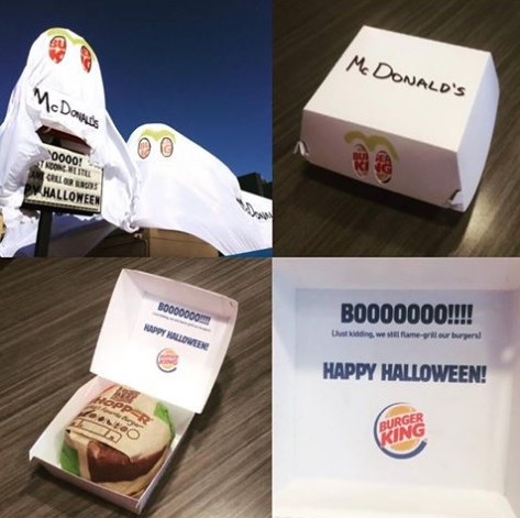A unos días de celebrar Halloween, al rey de las hamburguesas se le ocurrió cubrir su fachada y el tótem que sostiene su logotipo con una manta a manera de fantasma que en la parte superior de los hoyos que representan los ojos del espectro se asomaba una «M» amarilla y en la parte lateral estaba escrito el nombre de su competencia.
