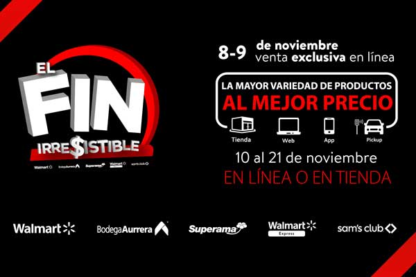 Este año, “El Fin Irresistible” arrancará con una preventa en línea los días 8 y 9 de noviembre y del 10 al 21 de noviembre en compras omnicanal en las más de 2,700 tiendas y clubes a nivel nacional, así como a través de las aplicaciones móviles, los servicios de entrega a domicilio y de recolección en tienda.