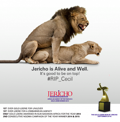 Otra empresa que indirectamente aprovechó el triste final de Cecil fue la agencia de publicidad Jericho Advertising, que al tener el mismo nombre con Jericho -el hermano de Cecil que ahora es el líder de la manada y de quien se presumía muerto- decidió lanzar una campaña de autopromoción en redes sociales con una imagen del felino montado sobre una leona y un texto que dice: «Jericho está sano y salvo. Es bueno estar en la cima. #RIP_Cecil».